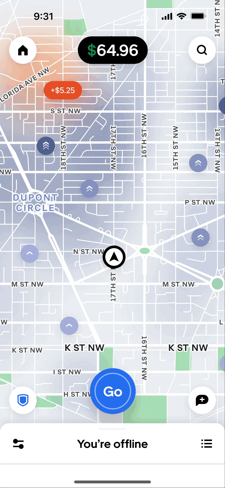 A new heatmap has been designed to give drivers more transparency about areas of high demand. Red areas indicate the shortest wait times, followed by orange, then yellow areas. Purple areas are where surge pricing is in effect, and show how long drivers waited on average for a trip, based on recent data. And drivers who are traveling from their homes to a high-demand area such as an urban center can now choose between a route that gets them there as quickly as possible or one that maximizes fares along the way.